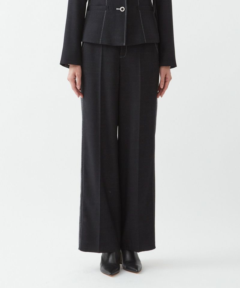 イタリア・REGGIANI社の経糸と横糸の色差で立体感を生み出した上質なウール混パンツ。ベーシックだからこそ、美しいシルエットや細部にまでこだわり、クオリティの良さを追求しました。サイドの裏使いがさりげないアクセントとなり、ワンランク上のスタイリングが楽しめます。同素材のジャケットを合わせてメンズライクな雰囲気で着こなすのはもちろん、フェミニンなトップスと合わせて柔らかな印象にも着こなせる、着回し力の高い一本です。