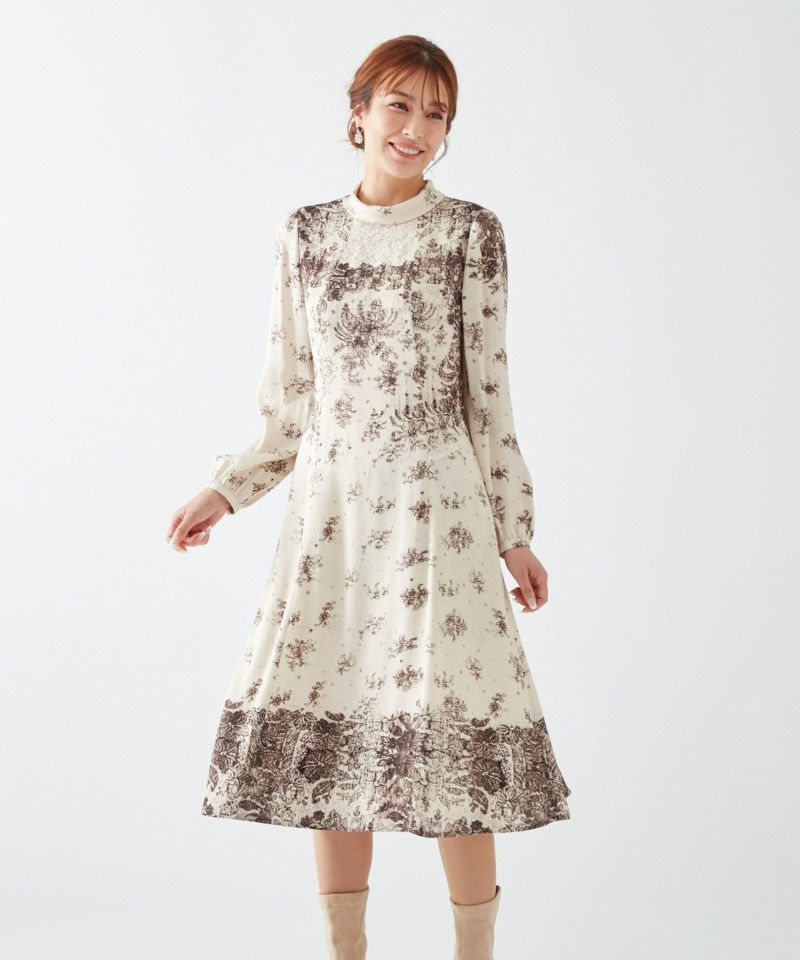 小花を織り上げたジャガードに、イタリア「Erica社」による優美なパネルプリントを重ねた、気品あふれるワンピース。グラデーションが描くフラワープリントのコントラストが奥行きを生み、大人の品格を際立たせます。レーヨン特有のしなやかなジャガード素材は、しっとりとした落ち感と軽やかなラグジュアリー感を兼ね備え、動きに合わせて美しく揺れるシルエットに。切替えによる肩や胸元の自然なコントラストが、ボディーラインをすっきりと見せてくれます。華やかさと躍動感がフレッシュな雰囲気を引き立てます。襟元はふんわりと折り返されたエレガントなデザインで、シンプルながらもモダンな華やかさを演出。胸もとにはフランス「GUEGAIN社」のエンブロイダリーレースを優しい色合いで配し、他にはない品格を感じさせるワンピースとなっております。ご友人とのお集まりや、社交シーン、改まった場でもお召しいただけるエレガントな一枚です。