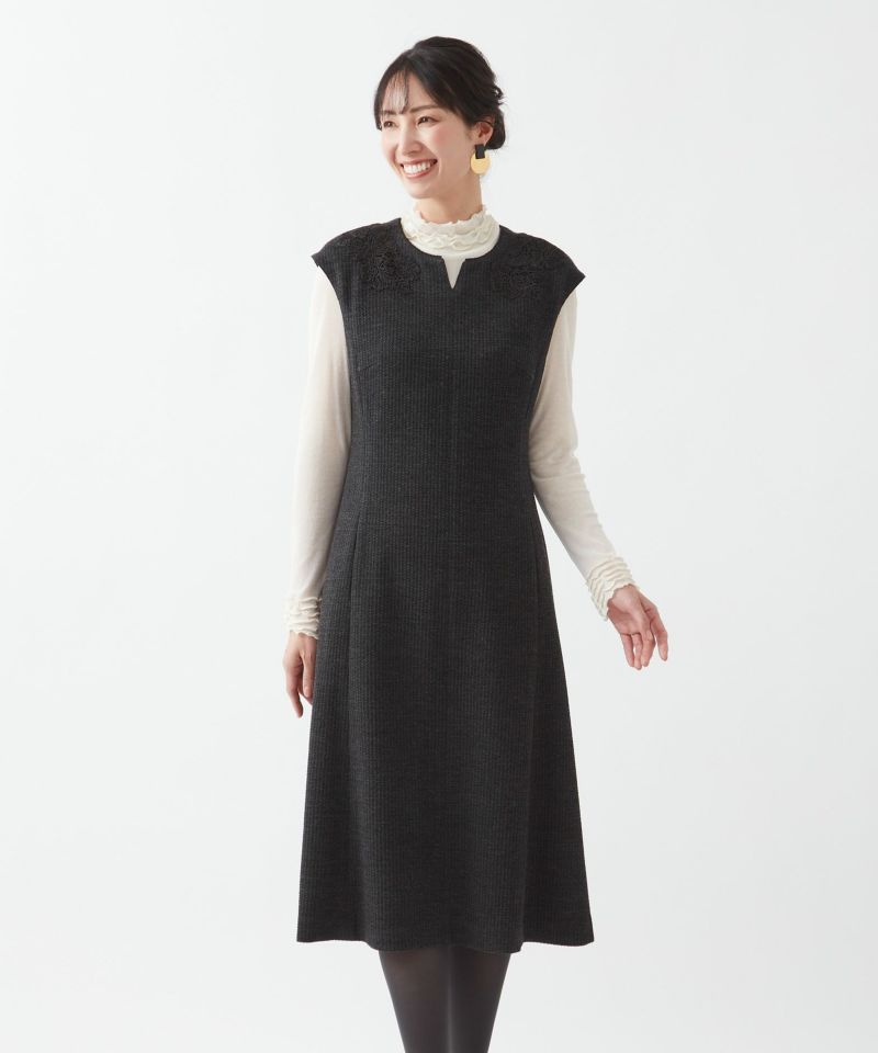 伸縮性のあるジャージー素材を使用し、快適な着心地ときちんと感を両立させたジャンパースカート。程よい肉感のある素材が、上品でエレガントな印象を演出します。さりげなくラメ入りのレースをあしらい、華やかさと引き締め効果をプラス。シワになりにくく気負わず着られるので、旅行や出張などON・OFF問わずに活躍する一枚です。同素材のジャケットも展開中で、セットアップでの着用もおすすめです。