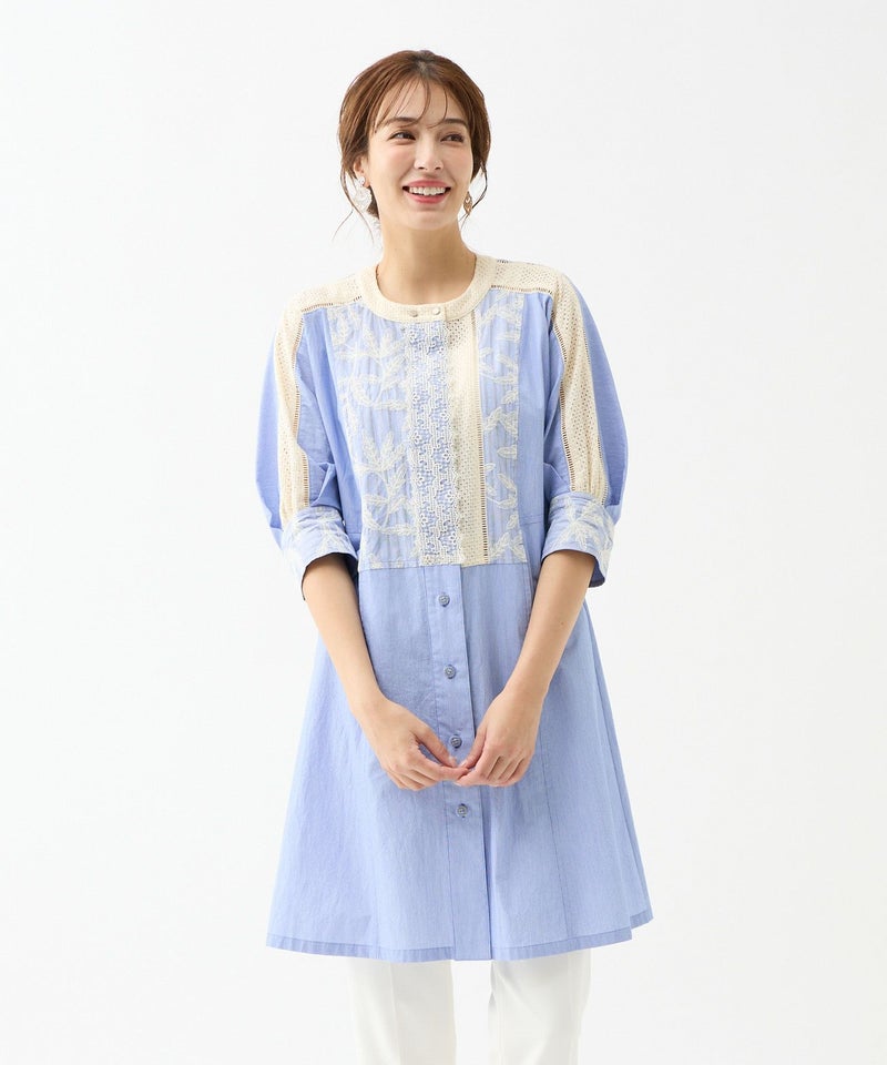 「異素材が重なり合う、立体感のあるエレガンス。」チュニック丈のシルエットに、刺繍とレースを贅沢にあしらい、奥行きのある表情をつくり出しています。単なるチュニックでは終わらない、着映え力の高いデザインです。同素材のスカートもラインナップ。