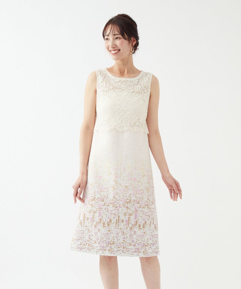 「優雅な光をまとう、グラデーション。」やわらかな色の移ろいが肌を美しく照らし、華やか過ぎない上品さを表現。レースからスカートへ続くグラデーションが縦ラインを強調し、すっきりとした印象に。“特別感”と“透明感”を両立した、洗練されたデザイン性が魅力です。