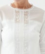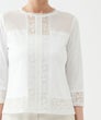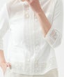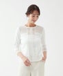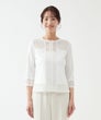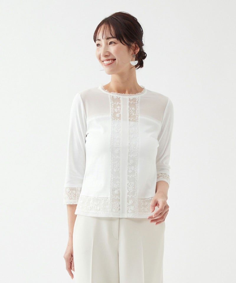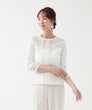 「レースが描く、光をまとう一枚。」フランス製のエンブロイダリーレースを贅沢に配し、胸元から裾へ流れるようにあしらった上質なトップス。繊細なシアーがそっと肌に光を落とし、日常をやさしく格上げしてくれます。