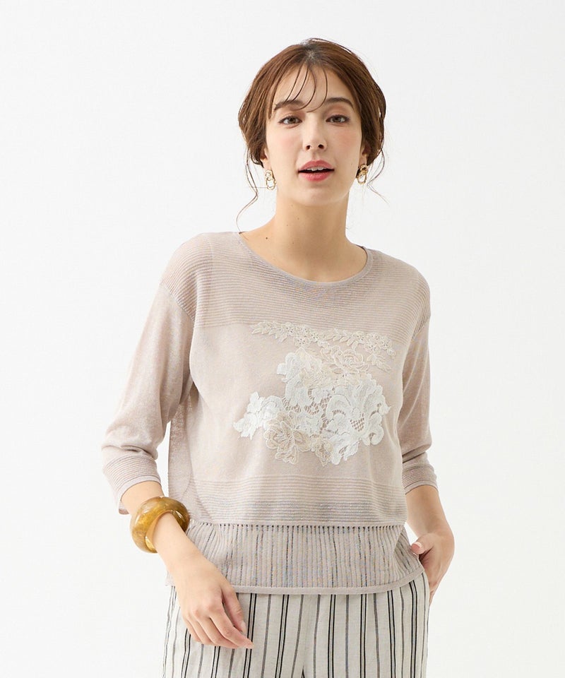 「極上レースが描く、大人のラグジュアリー。」フランスGUEGAIN社のエンブロイダリーレースとSOLSTISS社のリバーレースを重ねた、贅沢なフロントデザイン。繊細で深みのある表情が、夏の装いをアートのように彩り、上質素材ならではの気品を放ちます。