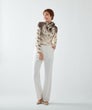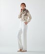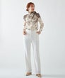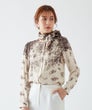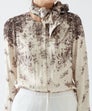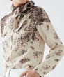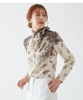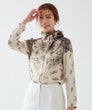 小花柄ジャガードに、イタリア「Erica社」の優美なパネルプリントを施したブラウス。フラワープリントのグラデーションが美しいコントラストを生み出し、大人の品格を際立たせます。生地には、レーヨンならではのしなやかさと、落ち感のある上質なジャガード素材を使用。軽やかでありながらもラグジュアリーな表情が魅力です。襟元は丸いカーブのすっきりとしたデザイン。取り外し可能な共布リボン付きで、リボンを結んで華やかに、垂らしてシックに、ネックの内側に沿わせてハイネック風にアレンジするなど、スタイリングの幅も広がります。洗練されたデザインと多彩な着こなしが楽しめる、エレガントな一着。