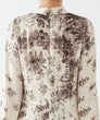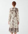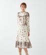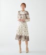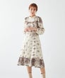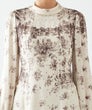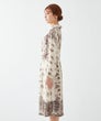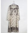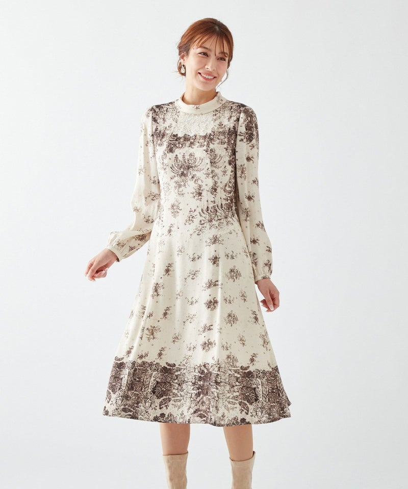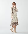 小花を織り上げたジャガードに、イタリア「Erica社」による優美なパネルプリントを重ねた、気品あふれるワンピース。グラデーションが描くフラワープリントのコントラストが奥行きを生み、大人の品格を際立たせます。レーヨン特有のしなやかなジャガード素材は、しっとりとした落ち感と軽やかなラグジュアリー感を兼ね備え、動きに合わせて美しく揺れるシルエットに。切替えによる肩や胸元の自然なコントラストが、ボディーラインをすっきりと見せてくれます。華やかさと躍動感がフレッシュな雰囲気を引き立てます。襟元はふんわりと折り返されたエレガントなデザインで、シンプルながらもモダンな華やかさを演出。胸もとにはフランス「GUEGAIN社」のエンブロイダリーレースを優しい色合いで配し、他にはない品格を感じさせるワンピースとなっております。ご友人とのお集まりや、社交シーン、改まった場でもお召しいただけるエレガントな一枚です。