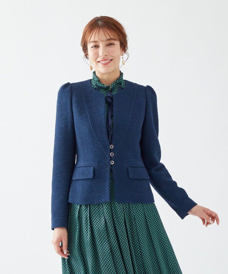 イタリア「GROSBER社」のネップが魅力の上質なテキスタイルを使用したジャケット。オートクチュールを思わせる技術を落とし込んだ立体的なパターンと縫製により、ショルダーやフロントの美しいシルエットが際立ちます。コンパクトな着丈はパンツにもスカートにも合わせやすく、女性らしくきちんとした佇まいに。「エレガンスとは内面の表れ」。そんな想いを込めて、特別なシーンや大切な時間を過ごすひとときに、自分らしさを引き立てる装いとしてアシストしてくれるアイテムです。同素材のスカートと合わせれば、洗練されたこだわりのあるセットアップスタイルに。