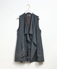 裾の繊細なカットワーク刺繍が目を引く、特別感のあるウール混ベスト。生地の持つ綺麗な落ち感と、縦のラインを強調したこだわりのシルエットが、エレガントで上品な印象を与えます。シンプルなアイテムと合わせても品良くさまになる一枚。同素材のパンツとのセットアップで、より洗練された着こなしもおすすめです。